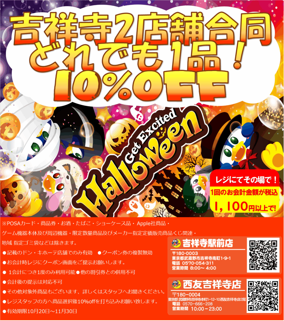 1100円以上のお会計で、参加証提示でお好きな商品1点10%オフでお願いします。(1日1回限り)対象外商品あり。